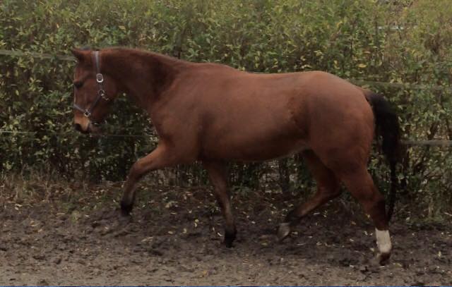 Onderstaande foto toont de benen van hetzelfde paard een paar maanden laten met iets meer training. Hier wordt meer ruimte in de draf gevraagd. Ik kan vertellen dat de hoofd-hals houding absoluut niet is zoals het plaatje zou moeten zijn – dit paard is namelijk van mijzelf, en de ruiter die de verruiming vraagt, ben ik. Het achterbeen treedt actief onder. Het schopt zelfs wel heel letterlijk het voorbeen weg.
