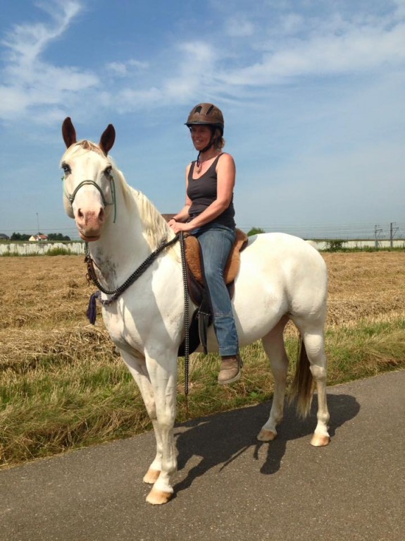 Jet is een 8-jarige ruin met een heel speciaal uiterlijk. Met zijn 2 blauwe ogen verovert hij zo je hart. Toen ik de allereerste keer bij Ingrid kwam, kreeg ik echter een heel ander beeld van Jet te zien. Ingrid vertelde me dat ze al verschillende instructeurs over de vloer had gehad in verschillende disciplines, maar ofwel gaven ze het op ofwel kwam er maar een kleine verbetering om nadien een terugval in Jet zijn gedrag te zien. Zelf deed ze nog wel Parelli grondwerk maar door de spanningen tussen hen was dit geen plezier voor beiden. Ingrid wou zo graag met hem kunnen wandelen, maar dat leek niet meer mogelijk door zijn onbetrouwbaar gedrag.